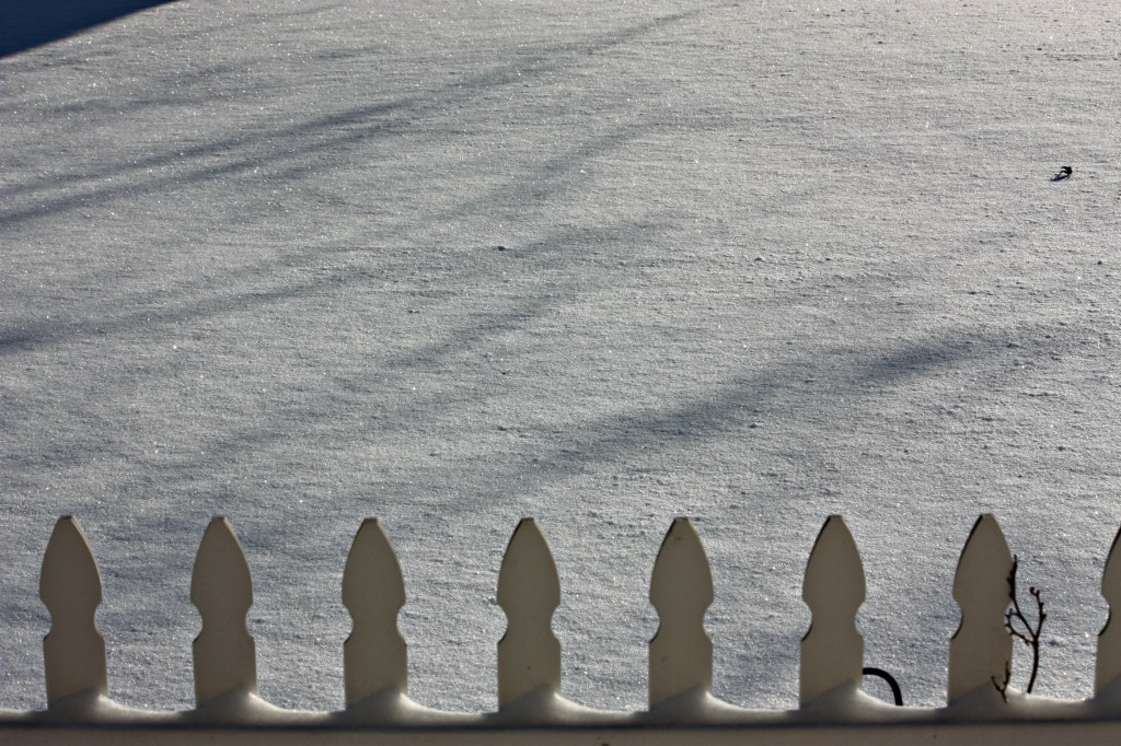 Yesterday’s picket fence is today casting shadows on a yard of snow.